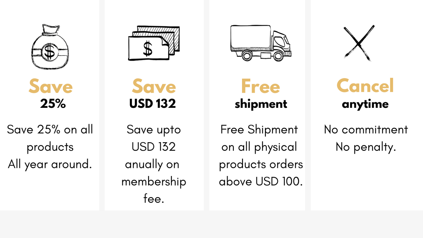 You save up to USD 132 on the membership fee; Plus you get USD 84 worth of digital products in month 12 of your membership i.e. a total saving of USD 216;